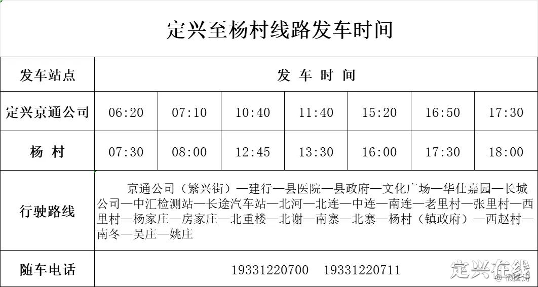 定兴至杨村(姚庄、吴庄)线路发车时间